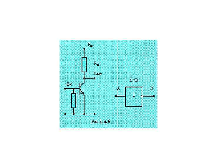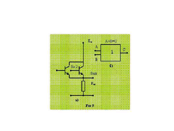 § § § Если на входы Вх1 и Вх2 поданы сигналы низкого уровня (логические « 0» ), то оба транзистора закрыты, ток через них не проходит, выходное напряжение на Rн близко к 0. Пусть на один из входов подано напряжение высокого уровня (логическая « 1» ). Тогда соответствующий транзистор откроется, однако другой останется закрытым, и ток через транзисторы и сопротивление нагрузки Rн по-прежнему не будет проходить. Следовательно, при подаче напряжения высокого уровня лишь на один из транзисторов схема не переключается и на выходе остается напряжение низкого уровня. И лишь при одновременной подаче на входы сигналов высокого уровня (логических « 1» ) на выходе мы также получим сигнал высокого уровня: открытые транзисторы практически не оказывают сопротивление току, все напряжение падает на сопротивлении нагрузки, потенциал вывода Вых становится высоким. На рис. 5, а приведена схема вентиля на биполярных транзисторах, реализующего логическую функцию «ИЛИ» , а на рис. 5, б дано его условное обозначение. Функция «ИЛИ» - логическое сложение, ее результат С равен единице, если хотя бы один из аргументов равен единице. Здесь транзисторы включены параллельно другу. Если оба закрыты, то их общее сопротивление велико и на выходе будет сигнал низкого уровня (логический « 0» ). Достаточно подать сигнал высокого уровня (логическую « 1» ) на один из транзисторов, как схема начнет пропускать ток и на сопротивлении нагрузки установится также сигнал высокого уровня (логическая « 1» ).