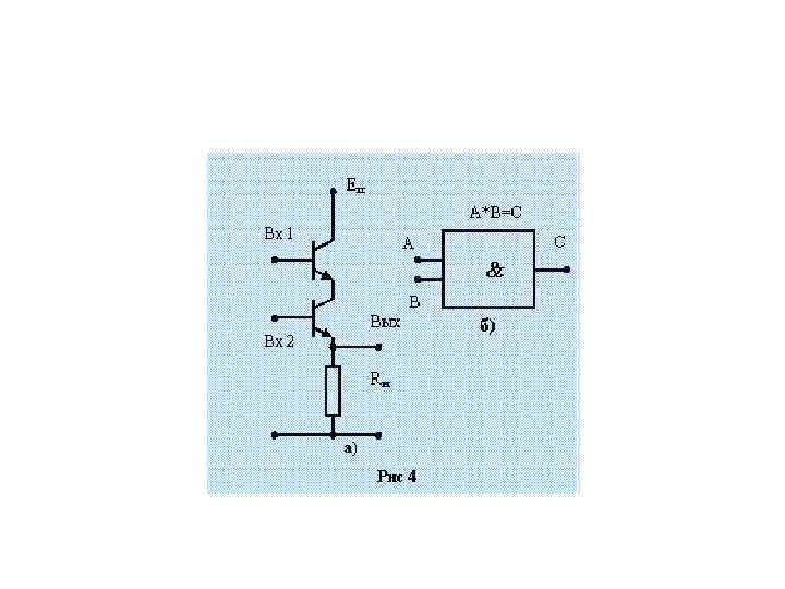 n n n Все многообразие устройств ЭВМ базируется на ограниченном наборе типовых электронных элементов. Поэтому принцип действия даже сверхсложного компьютера легко понять, если предварительно разобраться в структуре и принципе работы базовых электронных элементов, к которым относятся инвертор (ключ), вентиль и триггер. Инвертор. На рис. 3, а представлена схема электронного ключа на биполярном транзисторе, реализующая логическую функцию «НЕ» (отрицание), а на рис. 3, б - его условное обозначение. При подаче на вход схемы сигнала низкого уровня (логического « 0» ) транзистор будет заперт, т. е. ток через него проходить не будет, и на выходе будет сигнал высокого уровня (напряжение источника питания Еп, логическая « 1» ). Если же на вход схемы подать сигнал высокого уровня (логическую « 1» ), то транзистор «откроется» , начнет пропускать электрический ток. На его выходе за счет падения напряжения на сопротивлении нагрузки Rн установится напряжение низкого уровня (логический « 0» ). Таким образом, схема преобразует (инвертирует) сигналы одного уровня в другой, тем самым выполняя логическую функцию «НЕ» . Вентиль. На рис. 4, а изображена схема вентиля на биполярных транзисторах, реализующего логическую функцию «И» , а на рис. 4, б – его условное обозначение. Функция «И» - логическое умножение, ее результат С равен единице, когда оба аргумента, и А, и В, равны единице.
