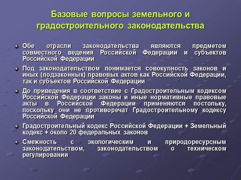Базовые вопросы земельного и градостроительного законодательства Обе отрасли законодательства являются предметом совместного ведения Российской Федерации и субъектов Российской Федерации Под законодательством понимается совокупность законов и иных (подзаконных) правовых актов как Российской Федерации, так и субъектов Российской Федерации До приведения в соответствие с Градостроительным кодексом Российской Федерации законы и иные нормативные правовые акты в Российской Федерации применяются постольку, поскольку они не противоречат Градостроительному кодексу Российской Федерации Градостроительный кодекс Российской Федерации + Земельный кодекс + около 20 федеральных законов Смежность с экологическим и природоресурсным законодательством, законодательством о техническом регулировании