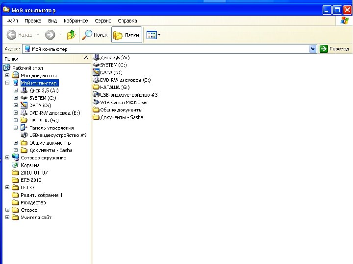 Пример ¡ ¡ ¡ Иерархической базой данных является Каталог папок Windows, с которым можно работать, запустив Проводник. Верхний уровень занимает папка Рабочий стол. На втором уровне находятся папки Мой компьютер, Мои документы, Сетевое окружение и Корзина, которые являются потомками папки Рабочий стол, а между собой является близнецами. В свою очередь, папка Мой компьютер является предком по отношению к папкам третьего уровня — папкам дисков (Диск 3, 5(А: ), (С: ), (D: ), (Е: ), (F: )) и системным пап кам(Принтеры, Панель управления и др. )