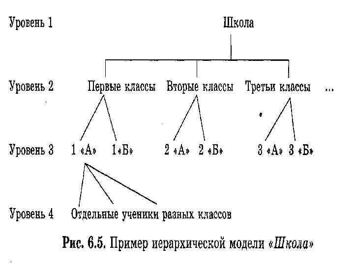 ИЕРАРХИЧЕСКАЯ МОДЕЛЬ Иерархическая модель базы данных представляет собой совокупность элементов, расположенных в порядке их подчинения от общего к частному и образующих перевернутое дерево (граф). Данная модель характеризуется такими параметрами, как уровни, узлы, связи. Принцип работы модели таков, что несколько узлов более низкого уровня соединяется при помощи связи с одним узлом более высокого уровня.