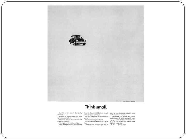 Накануне грянувшей в 1960 -е гг. Творческой революции, в 1959 г, креативная команда рекламного агентства DDB, выполняя заказ немецкого производителя автомобилей «Volkswagen» , создала шедевр, позже занявший первое место в рейтинге лучших рекламных кампании XX века по версии журнала «Ad. Age» : слоган «Think small» ( «Думай о малом» ) как нельзя более точно подходил к внешнему виду нелепого на первый взгляд «Beetle» (Жука» ). На фоне мощных и элегантных американских автомобилей «Жук» смотрелся некрасиво, нефункционально и несолидно. И все-таки, благодаря агентству DDB он стал одной из популярнейших иномарок в США. Особенно охотно его покупала молодежь, окончательно утвердившаяся в своем антагонизме по отношению к старшему поколению. С тех пор Volkswagen является одним из основных клиентов агентства.