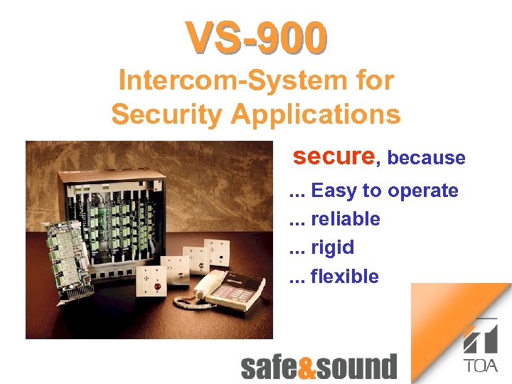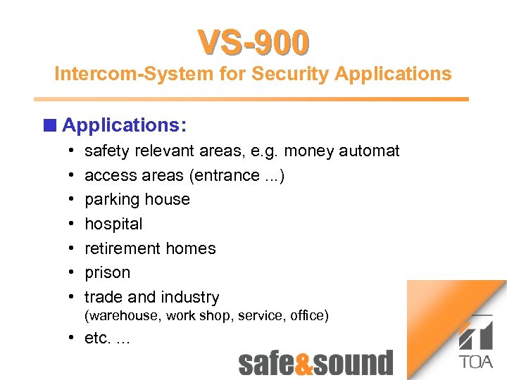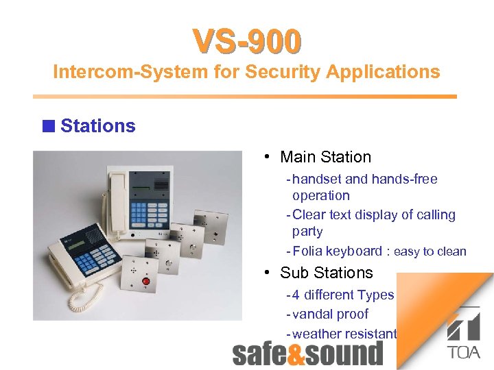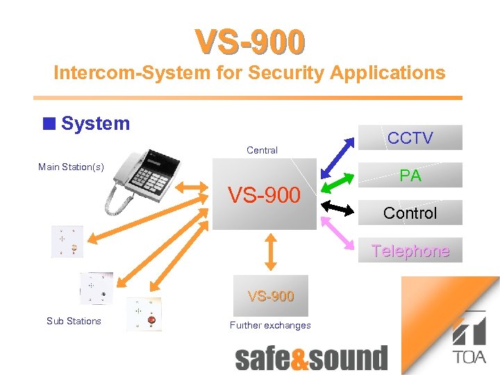 Time lapse Recorder VS-900 1 Money Automat 3 Bild Intercom-System for Security Applications Aufzug n Money System Automaton: no photo because of security reasons! VS-900 Central Main Station(s) VS 900 CCTV PA Control Telephone VS 900 Sub Stations Further exchanges 2 4