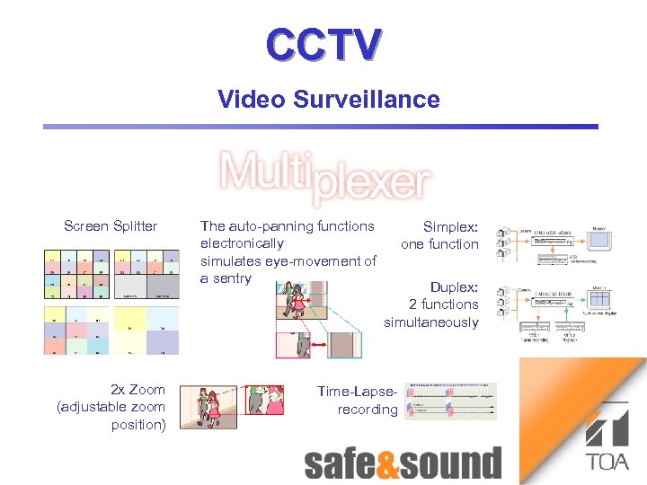 CCTV Time lapse Recorder Bild Aufzug Money Automaton: no photo because of security reasons! Screen Splitter 2 x Zoom (adjustable zoom position) 1 3 Video Surveillance VS-900 The auto panning functions electronically simulates eye movement of a sentry Simplex: one function Duplex: 2 functions simultaneously Time Lapse recording Money Automat 2 4