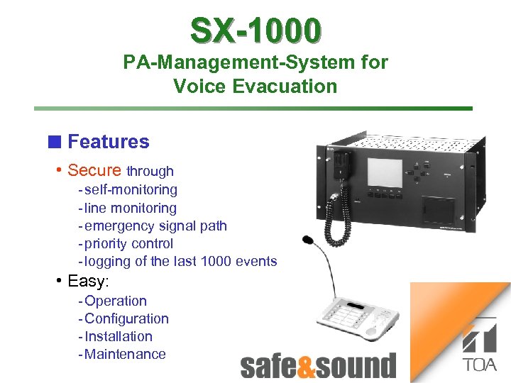 SX-1000 Time lapse Recorder Bild Aufzug PA-Management-System for Voice Evacuation Money Automaton: n Features • Secure through no photo because of security reasons! VS-900 self monitoring line monitoring emergency signal path priority control logging of the last 1000 events • Easy: Operation Configuration Installation Maintenance 1 3 Money Automat 2 4
