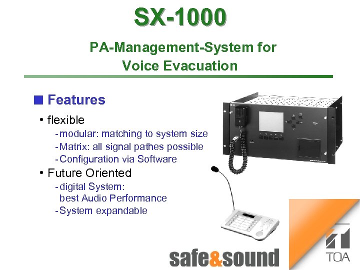 SX-1000 Time lapse Recorder Bild Aufzug Money Automaton: PA-Management-System for Voice Evacuation n Applications VS-900 • Hotel • Airport • Shopping Centre • Hospital • Factory • Exhibition and Congress Centre • Office Buildings. . . no photo because of security reasons! 1 3 Money Automat 2 4
