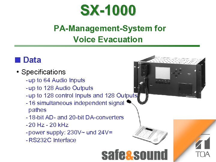 SX-1000 Time lapse Recorder Bild Aufzug Money Automaton: PA-Management-System for Voice Evacuation n Data no photo because of • security reasons! Specifications VS-900 up to 64 Audio Inputs up to 128 Audio Outputs up to 128 control Inputs and 128 Outputs 16 simultaneous independent signal pathes 18 bit AD and 20 bit DA converters 20 Hz 20 k. Hz power supply: 230 V~ und 24 V= RS 232 C Interface 1 3 Money Automat 2 4