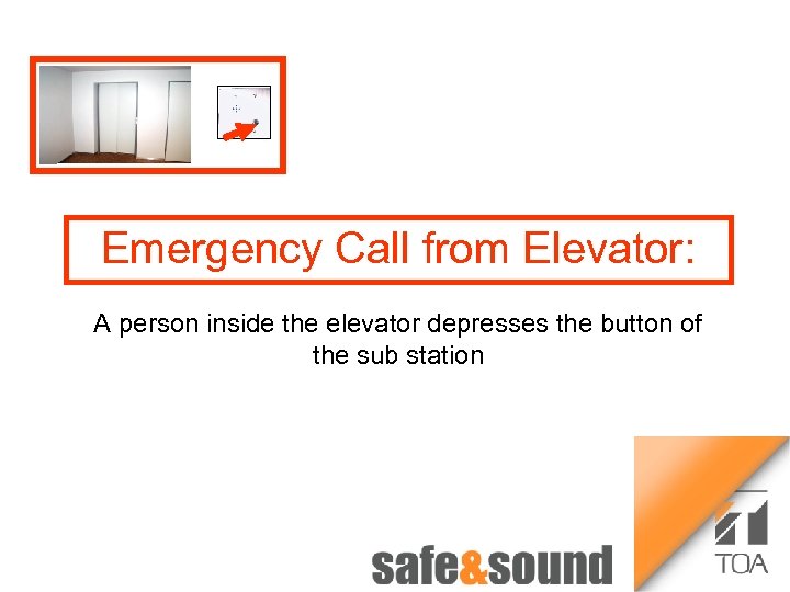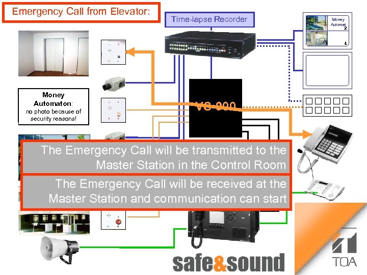 Emergency Call from Elevator: Time lapse Recorder 1 Bild Aufzug Money Automaton: no photo because of security reasons! 3 VS-900 The Emergency Call will be transmitted to the Master Station in the Control Room The Emergency Call will be received at the Master Station and communication can start Money Automat 2 4