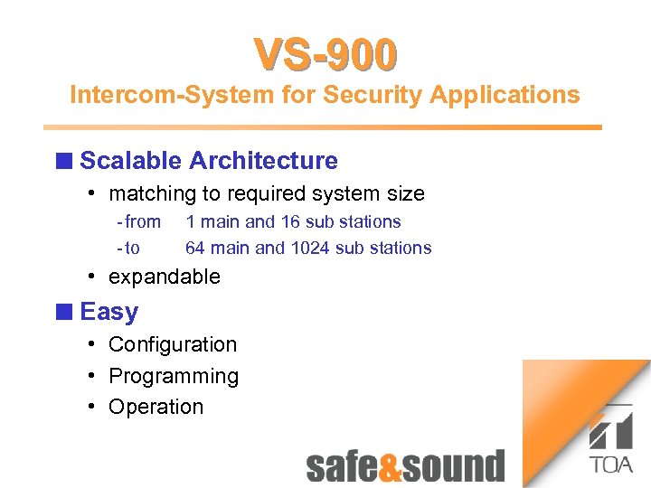 Time lapse Recorder VS-900 1 3 Bild Intercom-System for Security Applications Aufzug n Money Scalable Architecture Automaton: VS-900 no photo • matching to required system size because of security reasons! from to 1 main and 16 sub stations 64 main and 1024 sub stations • expandable n Easy • Configuration • Programming • Operation Money Automat 2 4