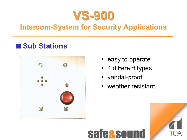 Time lapse Recorder VS-900 1 3 Bild Intercom-System for Security Applications Aufzug n Money Stations Automaton: no photo because of security reasons! Money Automat 2 4 VS-900 • Main Station handset and hands free operation Clear text display of calling party Folia keyboard : easy to clean • Sub Stations 4 different Types vandal proof weather resistant