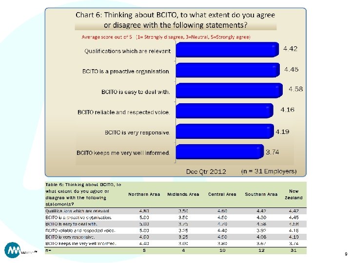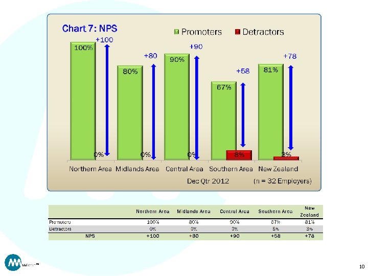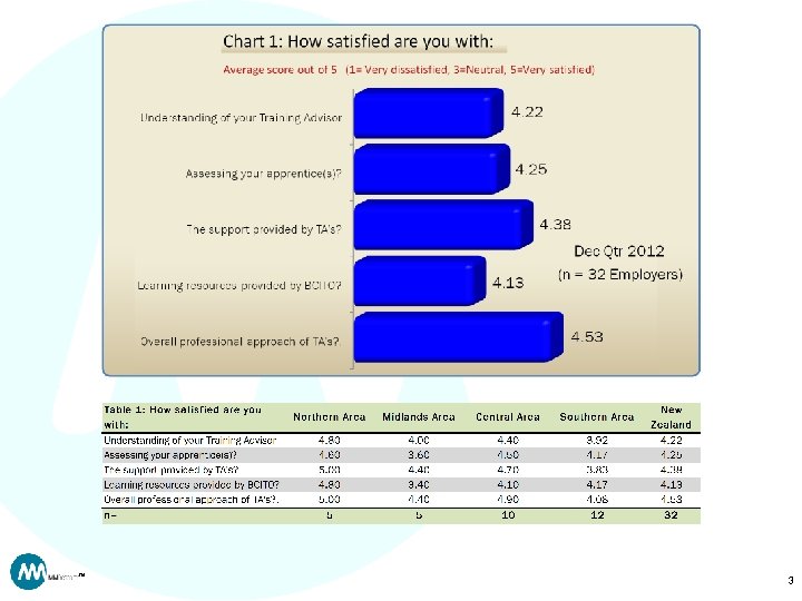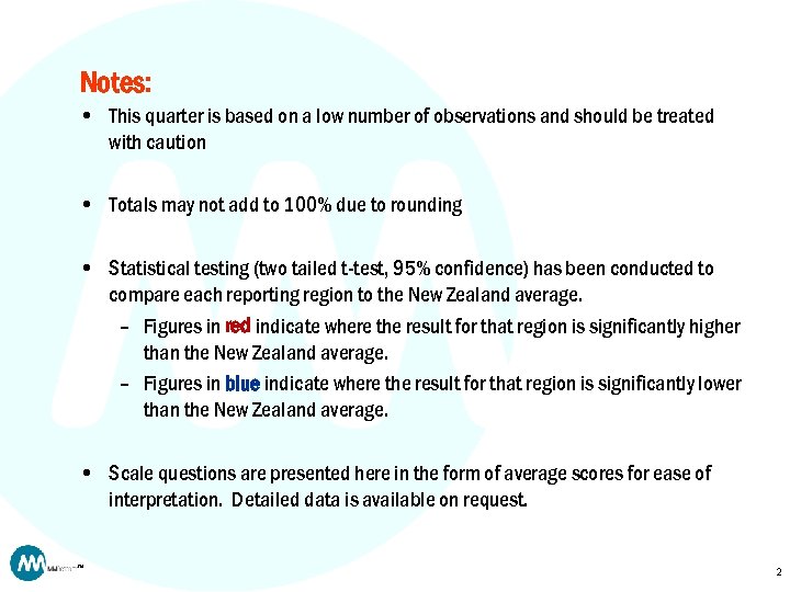 Notes: • This quarter is based on a low number of observations and should be treated with caution • Totals may not add to 100% due to rounding • Statistical testing (two tailed t-test, 95% confidence) has been conducted to compare each reporting region to the New Zealand average. – Figures in red indicate where the result for that region is significantly higher than the New Zealand average. – Figures in blue indicate where the result for that region is significantly lower than the New Zealand average. • Scale questions are presented here in the form of average scores for ease of interpretation. Detailed data is available on request. TM 2