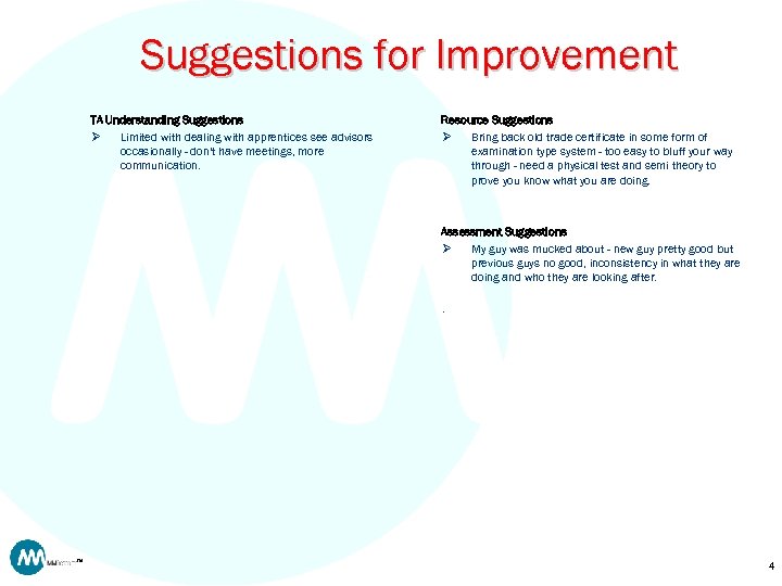 Suggestions for Improvement TA Understanding Suggestions Ø Limited with dealing with apprentices see advisors occasionally - don't have meetings, more communication. Resource Suggestions Ø Bring back old trade certificate in some form of examination type system - too easy to bluff your way through - need a physical test and semi theory to prove you know what you are doing. Assessment Suggestions Ø My guy was mucked about - new guy pretty good but previous guys no good, inconsistency in what they are doing and who they are looking after. . TM 4