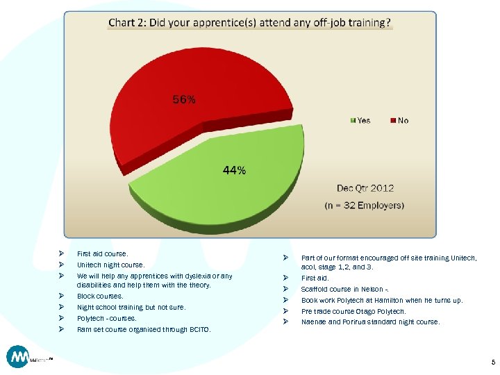 Ø Ø Ø Ø TM First aid course. Unitech night course. We will help any apprentices with dyslexia or any disabilities and help them with theory. Block courses. Night school training but not sure. Polytech - courses. Ram set course organised through BCITO. Ø Ø Ø Part of our format encouraged off site training Unitech, acol, stage 1, 2, and 3. First aid. Scaffold course in Nelson -. Book work Polytech at Hamilton when he turns up. Pre trade course Otago Polytech. Naenae and Porirua standard night course. 5