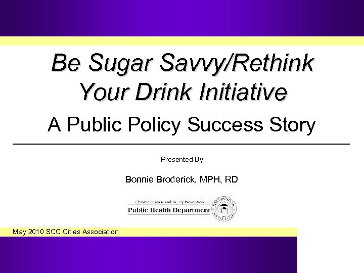 Be Sugar Savvy/Rethink Your Drink Initiative A Public Policy Success Story Presented By Bonnie Broderick, MPH, RD May 2010 SCC Cities Association