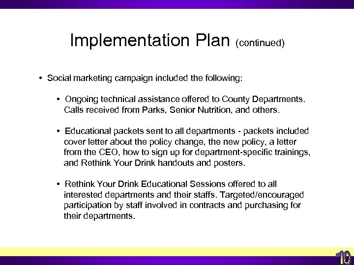 Implementation Plan (continued) • Social marketing campaign included the following: • Ongoing technical assistance offered to County Departments. Calls received from Parks, Senior Nutrition, and others. • Educational packets sent to all departments - packets included cover letter about the policy change, the new policy, a letter from the CEO, how to sign up for department-specific trainings, and Rethink Your Drink handouts and posters. • Rethink Your Drink Educational Sessions offered to all interested departments and their staffs. Targeted/encouraged participation by staff involved in contracts and purchasing for their departments.