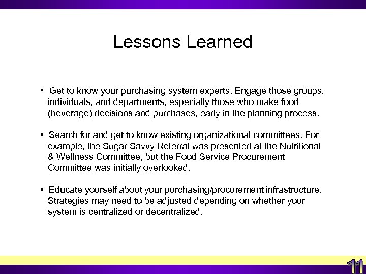 Lessons Learned • Get to know your purchasing system experts. Engage those groups, individuals, and departments, especially those who make food (beverage) decisions and purchases, early in the planning process. • Search for and get to know existing organizational committees. For example, the Sugar Savvy Referral was presented at the Nutritional & Wellness Committee, but the Food Service Procurement Committee was initially overlooked. • Educate yourself about your purchasing/procurement infrastructure. Strategies may need to be adjusted depending on whether your system is centralized or decentralized.