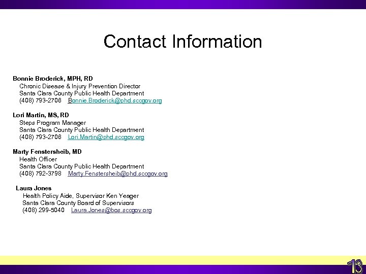 Contact Information Bonnie Broderick, MPH, RD Chronic Disease & Injury Prevention Director Santa Clara County Public Health Department (408) 793 -2706 Bonnie. Broderick@phd. sccgov. org Lori Martin, MS, RD Steps Program Manager Santa Clara County Public Health Department (408) 793 -2706 Lori. Martin@phd. sccgov. org Marty Fenstersheib, MD Health Officer Santa Clara County Public Health Department (408) 792 -3798 Marty. Fenstersheib@phd. sccgov. org Laura Jones Health Policy Aide, Supervisor Ken Yeager Santa Clara County Board of Supervisors (408) 299 -5040 Laura. Jones@bos. sccgov. org