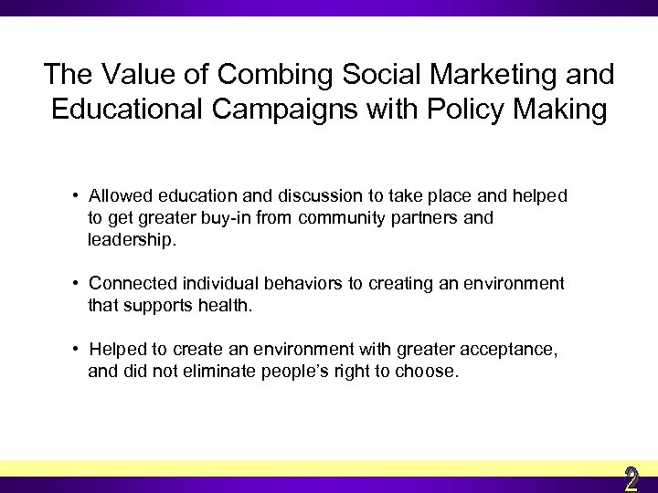 The Value of Combing Social Marketing and Educational Campaigns with Policy Making • Allowed education and discussion to take place and helped to get greater buy-in from community partners and leadership. • Connected individual behaviors to creating an environment that supports health. • Helped to create an environment with greater acceptance, and did not eliminate people’s right to choose.