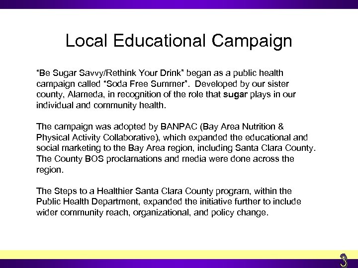 Local Educational Campaign “Be Sugar Savvy/Rethink Your Drink” began as a public health campaign called “Soda Free Summer”. Developed by our sister county, Alameda, in recognition of the role that sugar plays in our individual and community health. The campaign was adopted by BANPAC (Bay Area Nutrition & Physical Activity Collaborative), which expanded the educational and social marketing to the Bay Area region, including Santa Clara County. The County BOS proclamations and media were done across the region. The Steps to a Healthier Santa Clara County program, within the Public Health Department, expanded the initiative further to include wider community reach, organizational, and policy change.