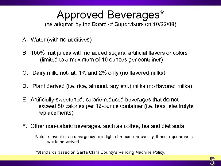 Approved Beverages* (as adopted by the Board of Supervisors on 10/22/08) A. Water (with no additives) B. 100% fruit juices with no added sugars, artificial flavors or colors (limited to a maximum of 10 ounces per container) C. Dairy milk, not-fat, 1% and 2% only (no flavored milks) D. Plant derived (i. e. rice, almond, soy etc. ) milks (no flavored milks) E. Artificially-sweetened, calorie-reduced beverages that do not exceed 50 calories per 12 -ounce container (i. e. teas, electrolyte replacements) F. Other non-caloric beverages, such as coffee, tea and diet soda Note: In event of an emergency or in light of medical necessity, these requirements would be waived. *Standards based on Santa Clara County’s Vending Machine Policy.