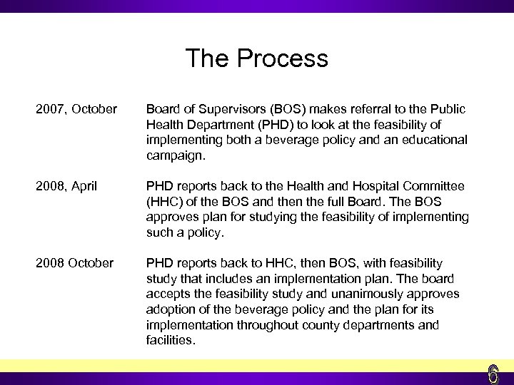 The Process 2007, October Board of Supervisors (BOS) makes referral to the Public Health Department (PHD) to look at the feasibility of implementing both a beverage policy and an educational campaign. 2008, April PHD reports back to the Health and Hospital Committee (HHC) of the BOS and then the full Board. The BOS approves plan for studying the feasibility of implementing such a policy. 2008 October PHD reports back to HHC, then BOS, with feasibility study that includes an implementation plan. The board accepts the feasibility study and unanimously approves adoption of the beverage policy and the plan for its implementation throughout county departments and facilities.