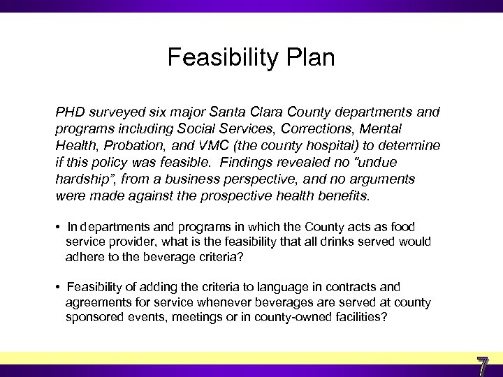 Feasibility Plan PHD surveyed six major Santa Clara County departments and programs including Social Services, Corrections, Mental Health, Probation, and VMC (the county hospital) to determine if this policy was feasible. Findings revealed no “undue hardship”, from a business perspective, and no arguments were made against the prospective health benefits. • In departments and programs in which the County acts as food service provider, what is the feasibility that all drinks served would adhere to the beverage criteria? • Feasibility of adding the criteria to language in contracts and agreements for service whenever beverages are served at county sponsored events, meetings or in county-owned facilities?