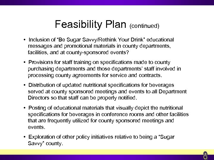 Feasibility Plan (continued) • Inclusion of “Be Sugar Savvy/Rethink Your Drink” educational messages and promotional materials in county departments, facilities, and at county-sponsored events? • Provisions for staff training on specifications made to county purchasing departments and those departments’ staff involved in processing county agreements for service and contracts. • Distribution of updated nutritional specifications for beverages served at county sponsored meetings and events to all Department Directors so that staff can be properly notified. • Posting of educational materials that visually depict the nutritional specifications for beverages in conference rooms and other facilities that are frequently utilized for county sponsored meetings and events. • Exploration of other policy initiatives relative to being a “Sugar Savvy” county.