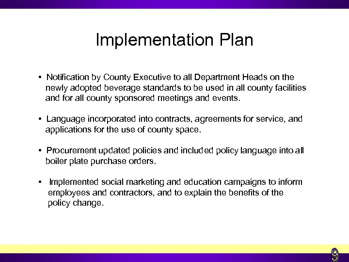 Implementation Plan • Notification by County Executive to all Department Heads on the newly adopted beverage standards to be used in all county facilities and for all county sponsored meetings and events. • Language incorporated into contracts, agreements for service, and applications for the use of county space. • Procurement updated policies and included policy language into all boiler plate purchase orders. • Implemented social marketing and education campaigns to inform employees and contractors, and to explain the benefits of the policy change.