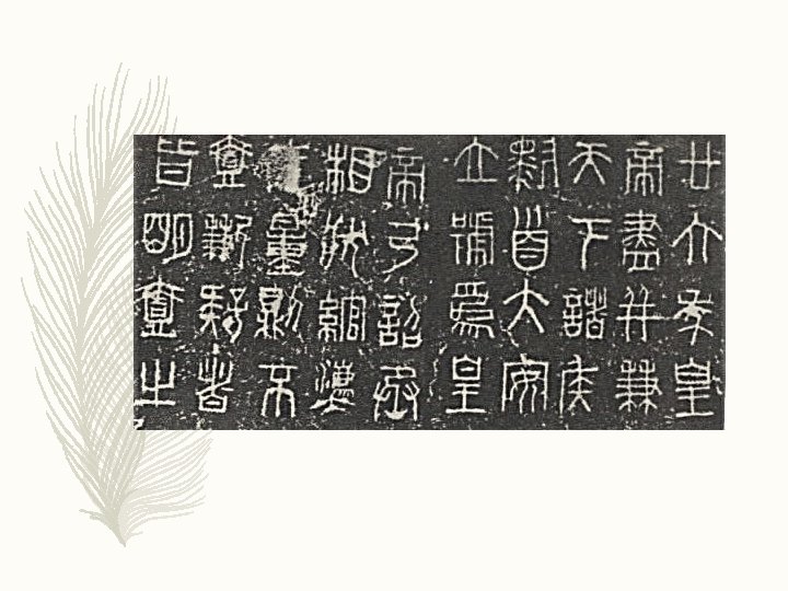三、小篆 – 小篆是在秦始皇统一中国后(前 221年),推行“书同文,车同轨”, 统一度量衡的政策,由宰相李斯 负责,在秦国原来使用的大篆籀 文的基础上,进行简化,取消其 他六国的异体字,创制的统一文 字汉字书写形式。一直在中国流 行到西汉末年(约公元8年),才 逐渐被隶书所取代。但由于其字 体优美,始终被书法家所青睐。 又因为其笔画复杂,形式奇古而 且可以随意添加曲折,印章刻制 上,尤其是需要防伪的官方印章。