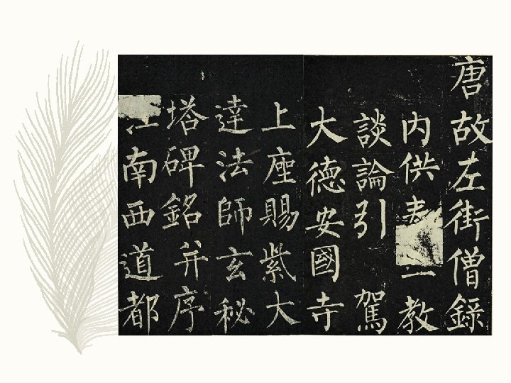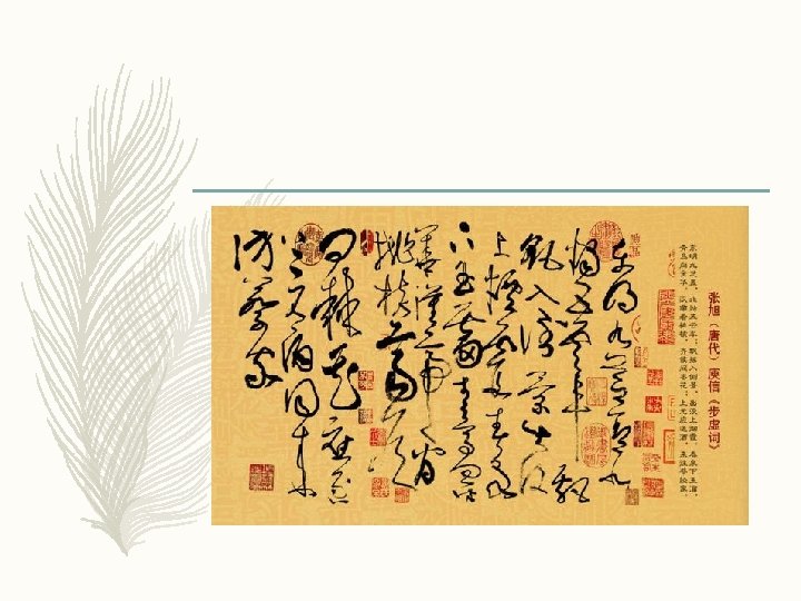 – 拜师以后,张旭却没有透露半点书法秘诀。他只是给颜 真卿介绍了一些名家字帖,简单地指点一下字贴的特点, 让颜真卿临摹。有时候,他带着颜真卿去爬山,去游水, 去赶集、看戏,回家后又让颜真卿练字,或看他挥毫疾 书。