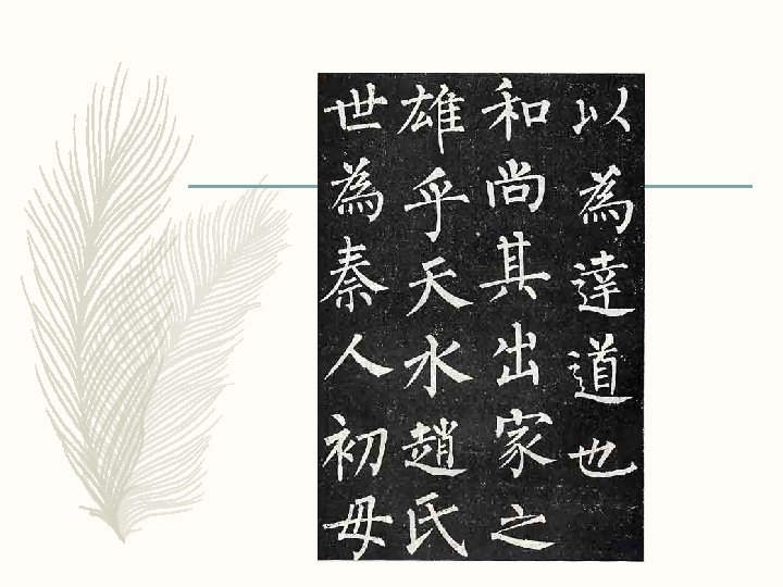 – 现在通行的汉字手写正体字,它是由隶书演变来的,也叫 正楷、真书。始于汉末,通行至今,长盛不衰。 – 特点:章法规整、结构严谨,体势上呈长方,笔画平直、 均匀。 颜筋柳骨 颜真卿 柳公权