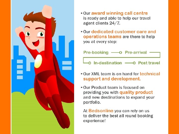 • Over 35, 000 hotels & self catering establishments worldwide. • Travel extras including transfers, car hire, excursions, entrance tickets, etc. • 24/7 call centre. • We offer very competitive commissions levels and additional incentives are available. • Dedicated UK sales manager as point of contact. • User-friendly system; 100% live availability and vouchers produced instantly. • Flexible cancellation policies. Most bookings can be cancelled free up to 24 hours before arrival. • Free amendments & modifications. • Over 100 destination offices worldwide giving us the edge over our competitors.