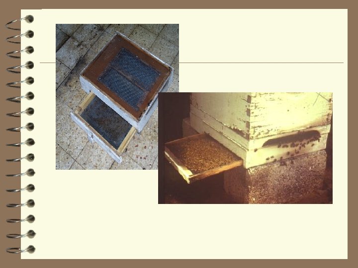 Varroa control by IPM 4 Drone cells “traps”. 4 Uncapping the brood cells or removing them from the hive. 4 Treating against varroa when there is minimum brood or while requeening. 4 Heating the hive. 4 Traps on the bottom of the hive by placing sticky and/or screened board. 4 Using smaller cell foundations in the brood chamber. 4 Introducing copper (Cu).