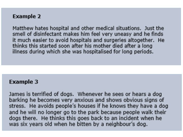 Scenario 3 As a child Rick used to visit the dentist for painful dental treatment, the dentist had a big grandfather clock in the waiting room. To this day whenever he hears the tick of a grandfather clock he starts to feel anxious.