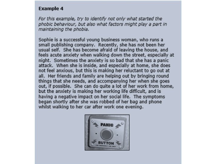 Scenario 2 Sarah suffers from agoraphobia. She is a keen A level student but is struggling to attend college because of the anxiety she suffers when attempting to leave the house in the morning. Her phobia began shortly after being mugged.