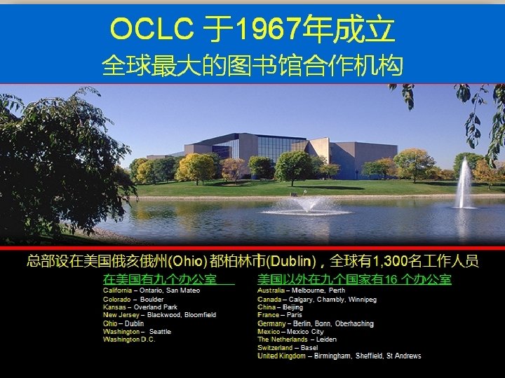 OCLC 简介 • 通过图书馆 合 作将人们 和知识 连 接在一起 • 全球图书馆 , 连 接在一起。 使命 目标 宗 旨 • 促进图书馆 的合作与交 流,实现 全球资 源共享 • 促进 存取全球信息 • 降低图书馆 信息服务 的成本 • 通过 全球图书馆 的合 作,帮助公众获 得知识 。 为 广大的用户发 展对 全世界各种信息的 应 用以及减低获 取信息的成本。