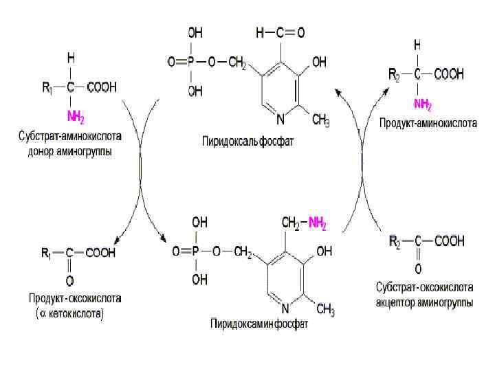 Все остальные аминокислоты могут окисляться и дезаминироваться только непрямым путем ( т. е. через дополнительную стадию трансаминирования). Коферментом трансаминаз является фосфорилированная форма Vit В 6 - пиридоксальфосфат, который в процессе реакции обратимо превращается в пиридоксальаминфосфат