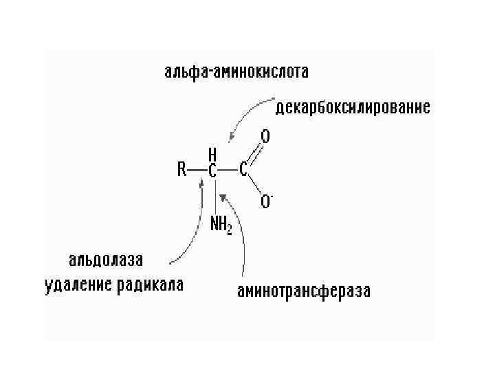 Кроме индивидуальных путей обмена, известен ряд превращений, общий почти для всех аминокислот. Это реакции: 1. по радикалу (R)- реакции гидроксилирования ( про----> o-про) разрыва радикала( образование Vit PP и ТРП); 2. Реакции на --СООН группу- декарбоксилирование( образование биогенных аминов, ГИС гистамин) 3. Реакции на группу NH 2 - дезаминирование 4 х типов: