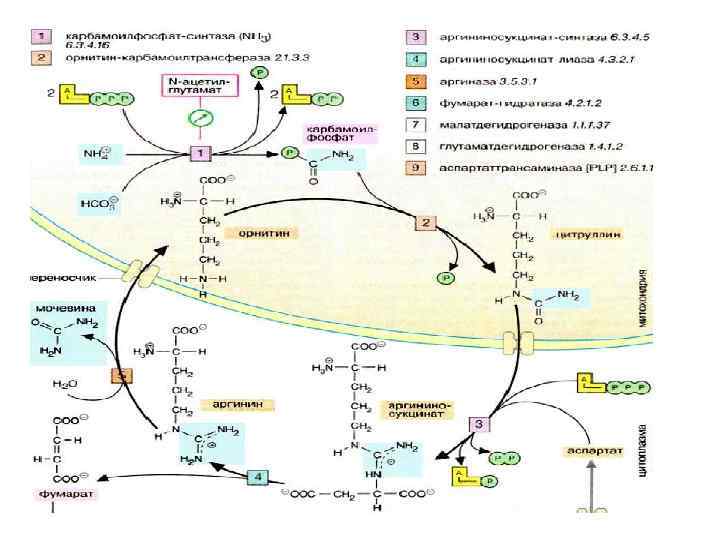Биологическая роль ЦСМ 1. Механизм детоксикации аммиака 2. Механизм регуляции КЩС( т. к. поставляет СО 2. 3. ЦСМ поставляет орнитин 4. Имея митохондриальную локализацию, ЦСМ регулирует потоки а/к по различным направлениям --- ГНГ, биосинтез белка, липогенез.