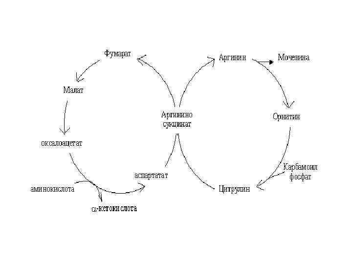 Гиперамонийем ия типа 2 Орнитин транскарбом оилаза Встречается наиболее часто, уровень аммиака и аминокислот в сыворотке повышены, повышено содержание в сыворотке оротовой кислоты из-за поступления митохондриального карбомоилфосфата в цитозоль и используемого в синтезе пиримидиновых нуклеотидов, лечение диетой богатой углеводами и бедной белками, детоксикация аммиака фенилацетатом натрия или бензойнокислым натрием Классическая цитруллинемия Аргининосук цинат синтетаза Эпизодическая гиперамонийемия, рвота, летаргия, атаксия, возможна кома: лечение назначением аргинина, для увеличения экскреции цитруллина, и бензойнокислого натрия для детоксикации аммиака Аргининосукци нат ацилурия Аргининосук цинат лиаза (аргининосук циназа) Эпизодические симптомы подобны классической цитруллинемии , повышение в плазме и спинномозговой жидкости аргининосукцината: лечение аргинином и бензойнокислым натрием Гипераргинине мия Аргиназа Редкое заболевание, прогрессивная спастическая квадриплегия и олигофрения, аммиак и аргинин повышены в спинномозговой жидкости и сыворотке, аргинин, лизин и орнитин повышены в моче: лечение включает диету с незаменимыми аминокислотами (кроме аргинина), низко белковая диета