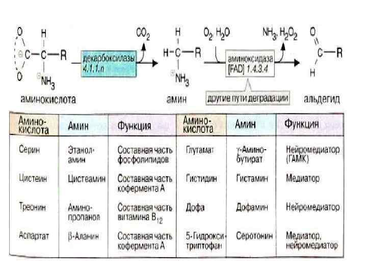 Многие моноамины и катехоламины инактивируются аминоксидазой (моноаминоксидазой, "МАО") путем дезаминирования с одновременным окислением в альдегиды. Следовательно, ингибиторы МАО играют важную роль при фармакологическом воздействии на метаболизм нейромедиаторов.