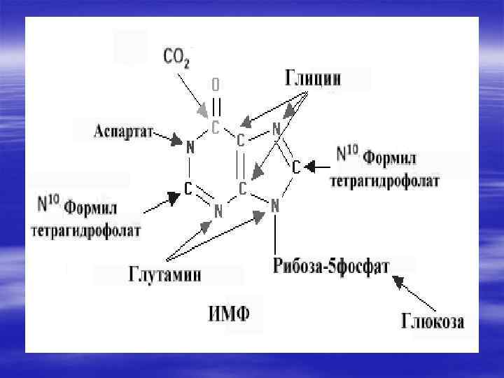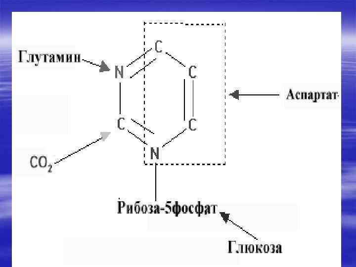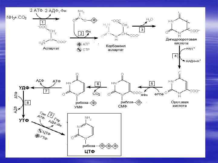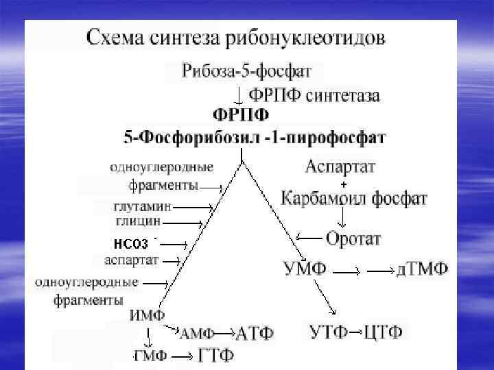 § Центральным промежуточным продуктом биосинтеза предшественников НК является мононуклеотид уридинмонофосфат- УМФ. § Путь синтеза пиримидиновых оснований отличается от пуриновых оснований
