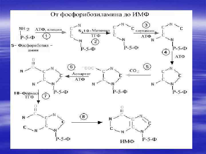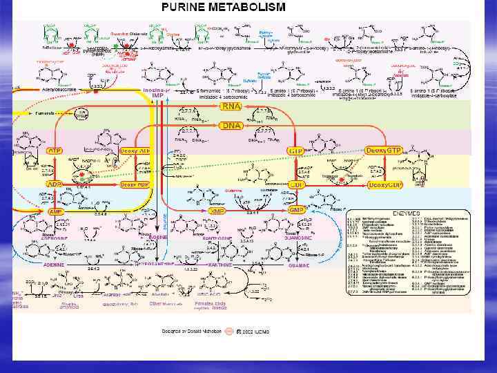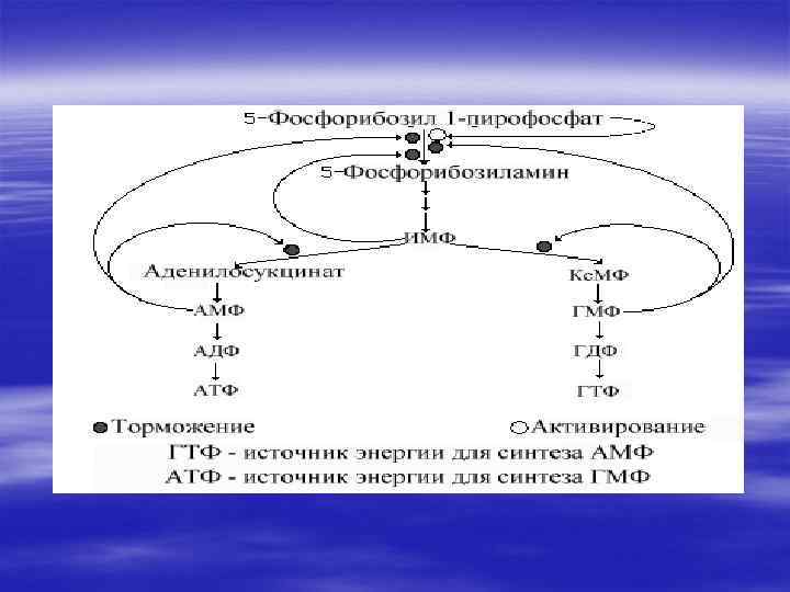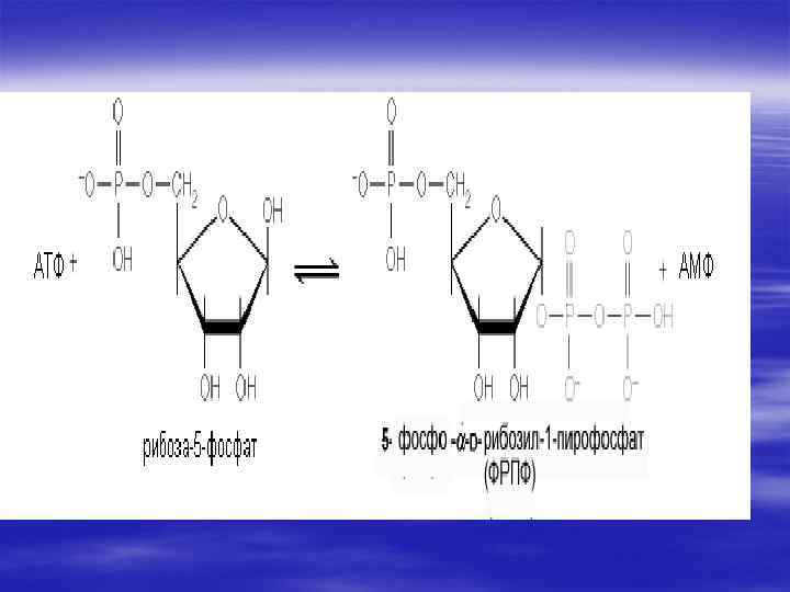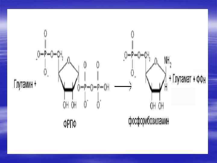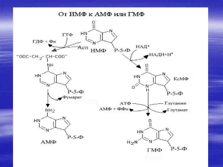 Путь « спасения» - повторное включение пуринов § Аденин + фосфорибозилдифосфат(ФРДФ)---- АМФ + Н 4 Р 2 О 7 § Гуанин + ФРДФ-- АМФ + Н 4 Р 2 О 7 Гипоксантин + ФРДФ--- ИМФ+ Н 4 Р 2 О 7