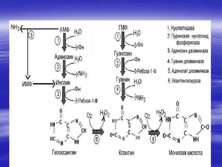 АМФ дезаминируется, образуя ИМФ, далее гипоксантин. Один и тот же фермент- ксантиноксидаза, превращает гипоксантин в ксантин, а последний в мочевую кислоту.