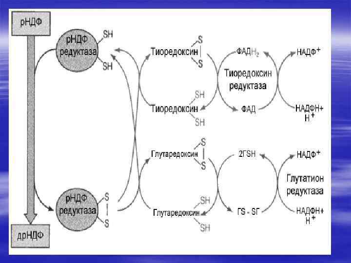 Биосинтез дезоксирибонуклеотидов § 2′- дезоксирибоза –структурный элемент ДНК, не синтезируется в виде свободного схара. , а образуется на стадии дифосфата при восстановлении рибонуклеозиддифосфатов. Это сложный процесс в котором участвует несколько белков. Восстановительные эквиваленты поставляет NADFH, они проходят через ряд О/В реакций. Основные ферменты на этом пути-рибонуклеотидредуктаза и тиреоредоксинредуктаза, восстанавливающие сульфгидрильные группы, а также тимидилатсинтетаза.