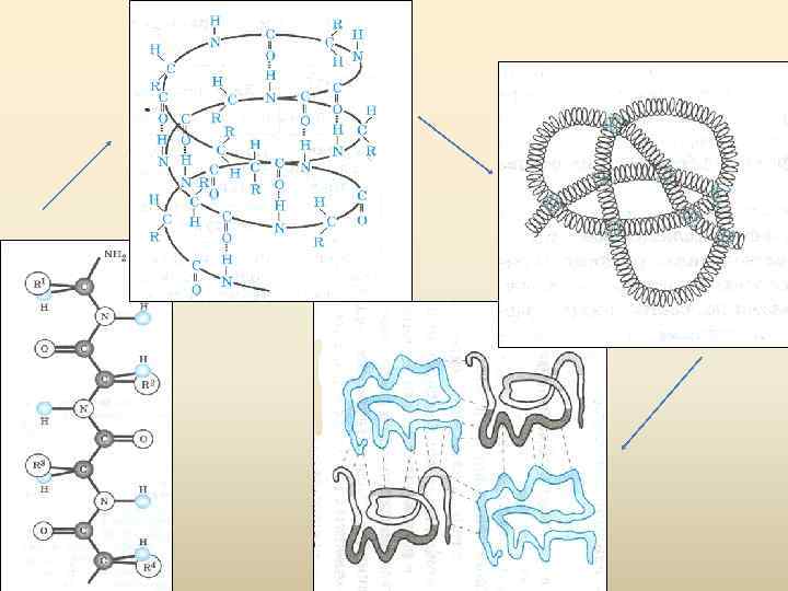 Уровни организации белковой молекулы Структура белковой молекулы Характеристика структуры Тип связи, определяющий структуру Первичная-линейная Порядок чередования аминокислот в полипептидной цепи пептидная связь –NH-CO- Вторичная-спиральная Закручивание полипептидной линейной цепи в спираль Внутримолекулярные водородные связи Третичная-глобулярная Упаковка вторичной спирали в клубокклубочковидная структура Дисульфидные и ионные связи Четвертичная Соединение нескольких глобул в сложный комплекс Все виды связей