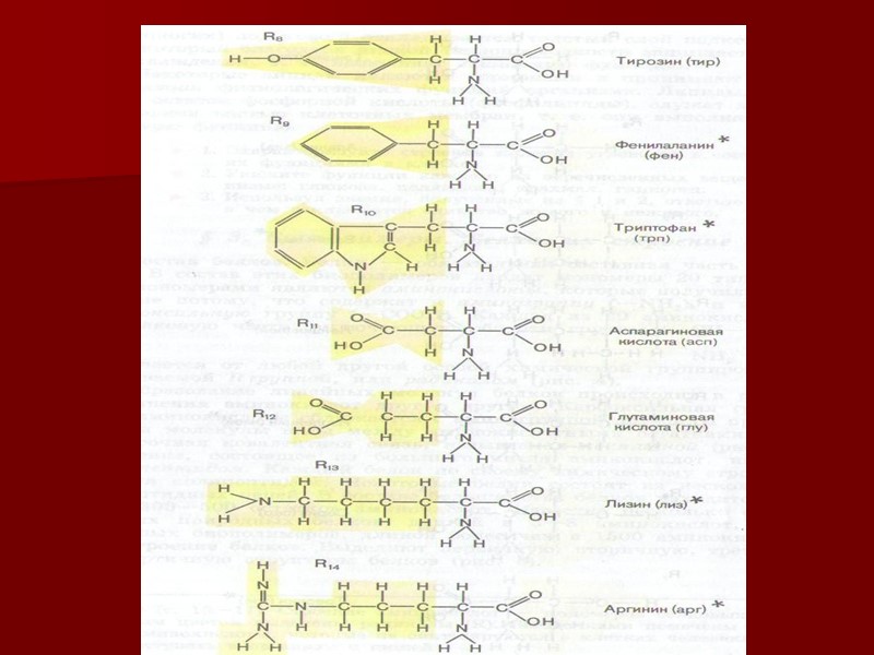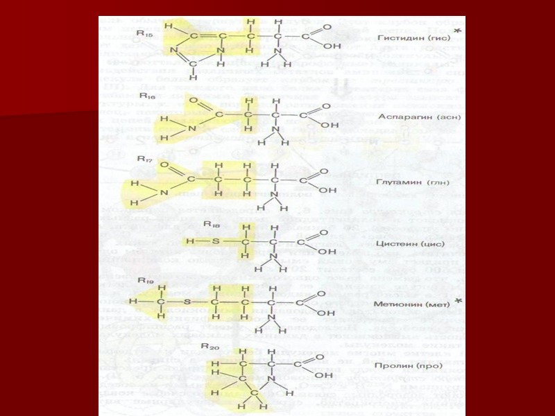 ПРОТЕНОГЕННЫЕ АМИНОКИСЛОТЫ (желтым цветом выделены радикалы ®, звездочками помечены незаменимые аминокислоты)