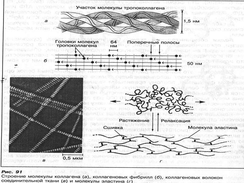 БЕЛКИ СОЕДИНИТЕЛЬНОЙ ТКАНИ Соединительная ткань (сухожилия, связки, органическая часть костей, хрящи, подкожная клетчатка, роговица глаза и.т.д.) выполняет строительную и опорную функцию. КОЛЛАГЕН – mm = 300000, не растворяется в воде и обладает высокой прочностью на разрыв. Особенность коллагенов – они не способны растягиваться. Каждая молекула коллагена состоит из трех полипептидных цепей, скрученных в виде трехжильного каната. Множество молекул коллагена объединяются в виде параллельных повторяющихся пучков, образуя фибриллы. Между отдельными фибриллами имеются поперечные водородные связи, благодаря чему образуются практически не растяжимые волокна. В состав молекулы коллагена в большом количестве входят две основные аминокислоты – глицин и аланин, а также 2 неосновные – 4-гидроксипролин и 5-гидроксилизин. Прочность коллагеновых волокон зависит от наличия в тканях витамина С, который участвует в образовании коллагена. ЭЛАСТИН – в большом количестве находится в связках, стенках крупных сосудов, особенно в аорте, а также в других эластичных тканях. Mm – 72000. Фибриллы эластина состоят из субъединиц – тропоэластина, которые соединены между собой и образуют сеть, способную проявлять большую упругость. Участвует аминокислота – десмин. Благодаря такому строению эластиновые волокна могут растягиваться в несколько раз и возвращаться к исходной длине при снятии нагрузки