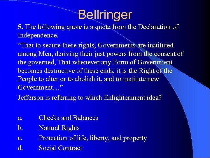 Bellringer 5. The following quote is a quote from the Declaration of Independence. “That to secure these rights, Governments are instituted among Men, deriving their just powers from the consent of the governed, That whenever any Form of Government becomes destructive of these ends, it is the Right of the People to alter or to abolish it, and to institute new Government…” Jefferson is referring to which Enlightenment idea? a. Checks and Balances b. Natural Rights c. Protection of life, liberty, and property d. Social Contract