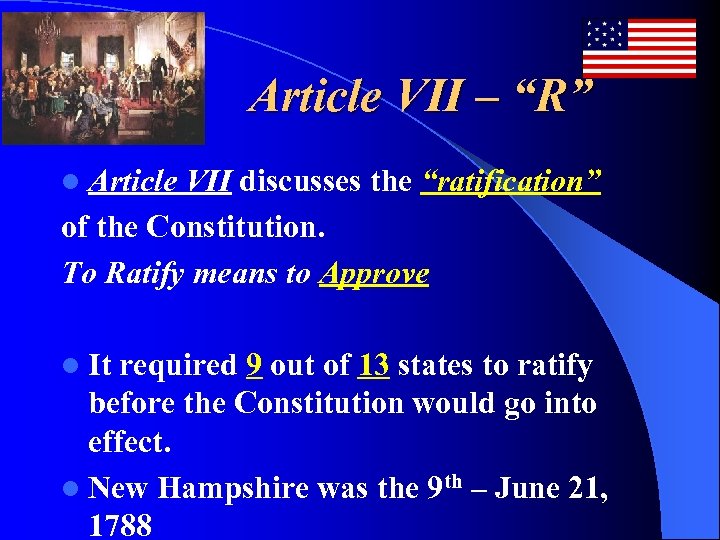 Article VII – “R” l Article VII discusses the “ratification” of the Constitution. To Ratify means to Approve l It required 9 out of 13 states to ratify before the Constitution would go into effect. l New Hampshire was the 9 th – June 21, 1788